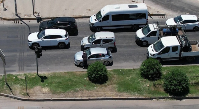 D-400 karayolunda kırmızı ışığın yanmasıyla araçların önüne geçip cam silme bahanesiyle dilenen kişiler dron ile görüntüledi. İki cam silen şahıslar, bir otomobil sürücüsü para vermeyince çılgına döndü.
