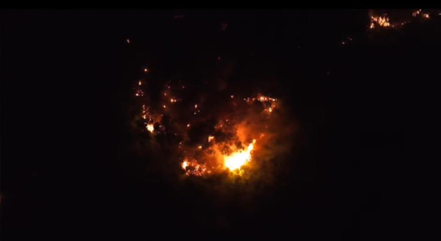 Öte yandan gece yangın havadan da görüntülendi. Alevlerin geniş bir alana yayıldığı görüntüler, yangının boyutunu gözler önüne serdi. Ekiplerin 14 saatlik mücadelesiyle kontrol altına alınan yangın bölgesinde soğutma çalışmalarının sürdüğü bildirildi.