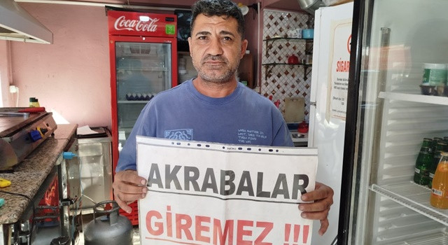 Büfe sahibi, yiyip içip para vermeyen akrabalarından sıkıldığı için dükkanına ’Akrabalar giremez’ yazılı pankart astı.